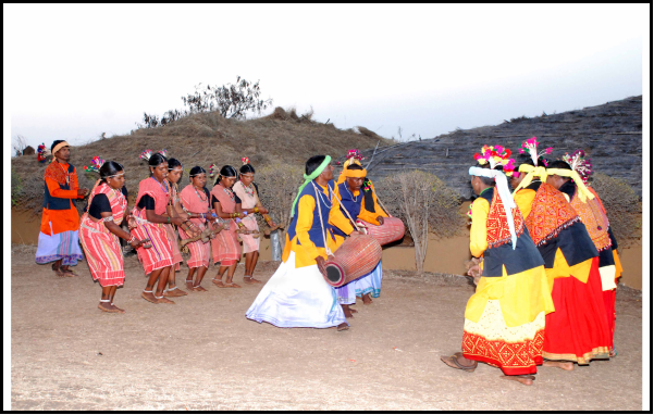 The people of this tribe perform Karma dance during Karma Puja,Padki dance on Diwali,and wedding dances during marriages. Both men and women participate in dances performed on music such asKarama songs, Vadaria songs, Suasongs, Phag,Bhajans, etc. These songs usually involve musical instruments.The dancers wear colourful costumes and ornaments. |